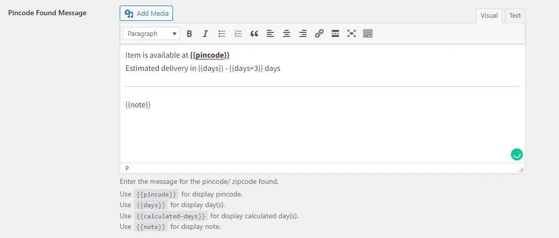If you want to show like, the Estimated delivery in 3-6 days then you have to use {{days}} placeholder to display the days you added in Global CSV or any Product Level methods and use {{days+3}} to add 3 more days in actual days.